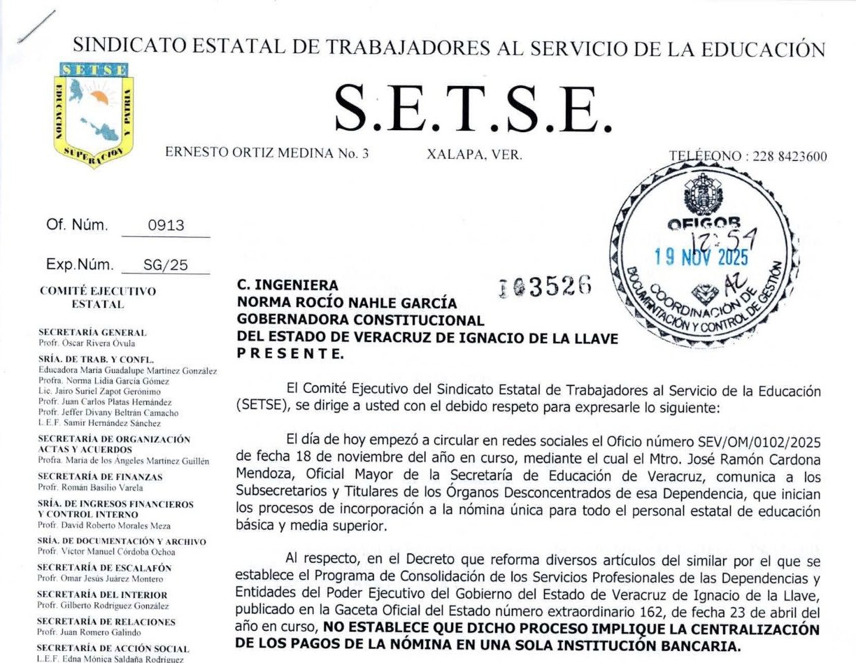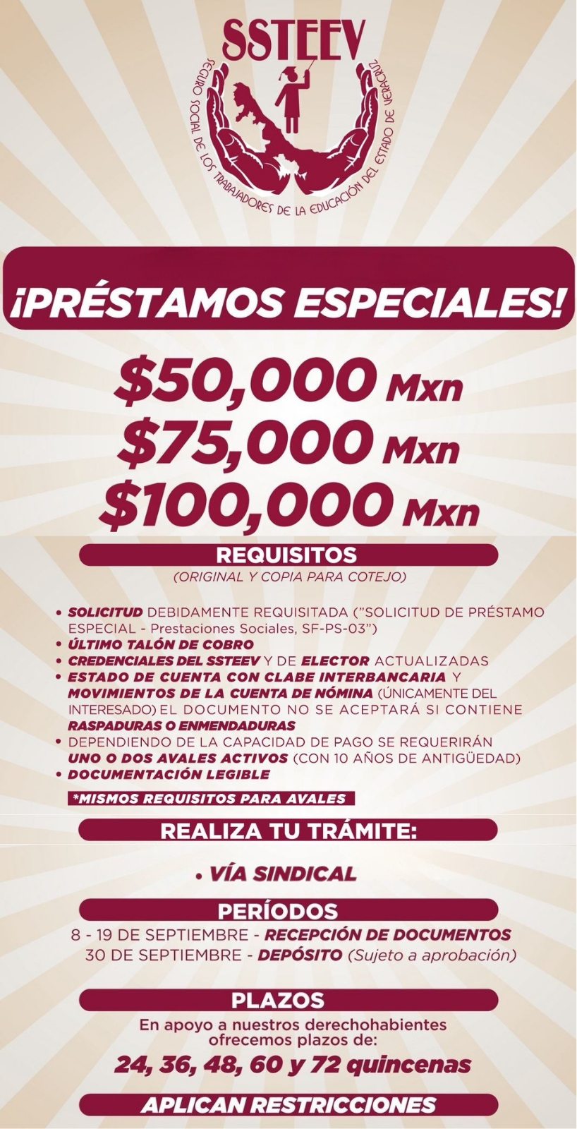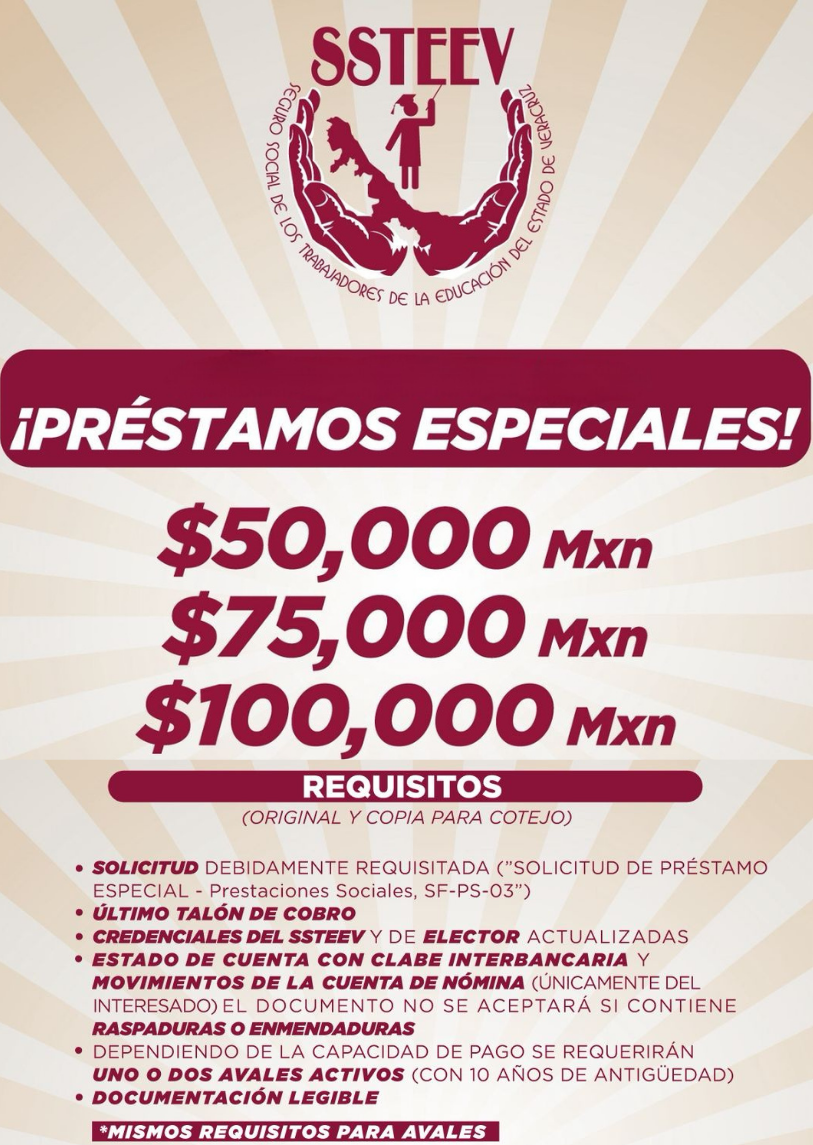 Se comunica que la recepción de solicitudes de préstamos por parte del Seguro Social de los Trabajadores de la Educación del Estado de Veracruz (SSTEEV) iniciará el martes 21 de enero de este año. Además, es importante señalar que toda la documentación debe presentarse en formato físico a través de sus representantes sindicales.