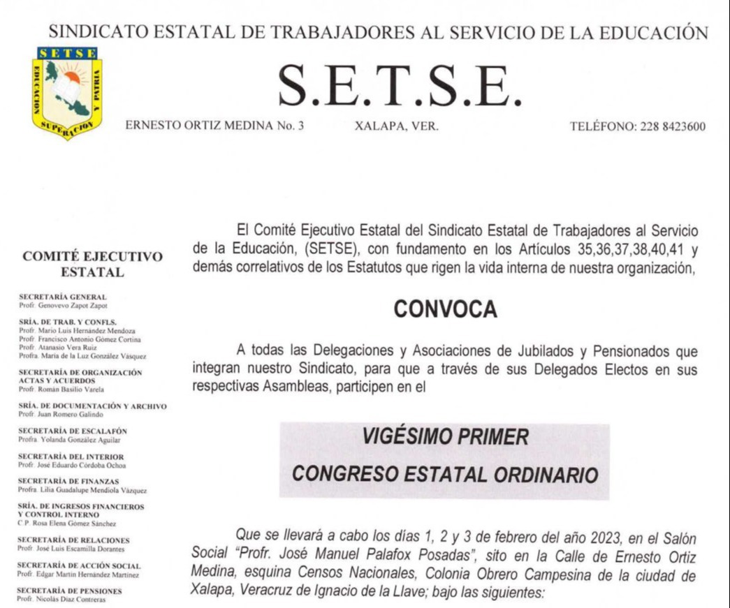 El Comité Ejecutivo Estatal del Sindicato Estatal de Trabajadores al Servicio de la Educación, SETSE, con fundamento en los Estatutos que rigen la vida interna de nuestra organización, CONVOCA a todas las Delegaciones y Asociaciones de Jubilados y Pensionados que integran nuestro Sindicato, para que a través de sus Delegados Electos en sus respectivas Asambleas, participen en el VIGÉSIMO PRIMER CONGRESO ESTATAL ORDINARIO