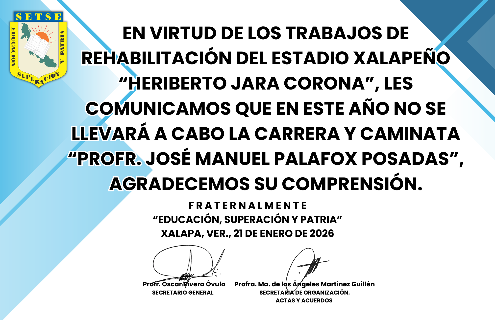 La agenda del sindicato estatal de trabajadores al servicio de la educación, registra como un día trágico el 29 de diciembre de 1997, hace 28 años del sensible fallecimiento del profesor José Manuel Palafox Posadas, fundador y primer secretario general de nuestro sindicato, sabemos que fue un luchador incansable, un hombre culto, sensato. Inteligente, consumado deportista por ello, paralelamente a su trabajo como profesor de educación primaria.